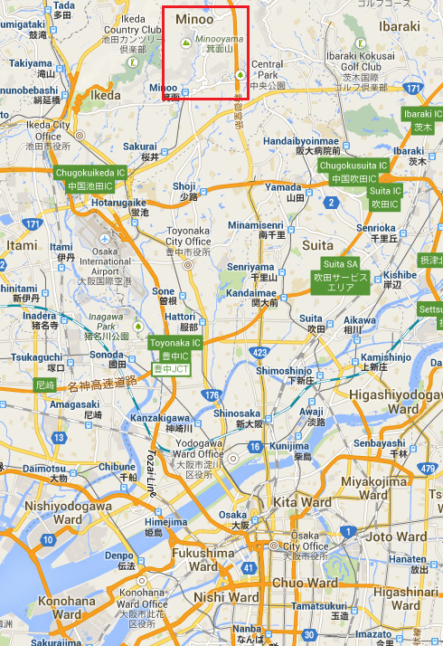 Last Sunday (February 9th, 2014) I went to Minō Kōen (Minō Park – 箕面公園). It is located North of Osaka (as I’m living in Toyonaka), so it was pretty quick to go there (see the map below).